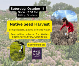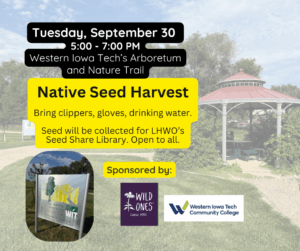 Join us for our next Native Seed Harvest at the beautiful Hilltop Gardens at 2801 S. Cecelia St in Sioux City’s Morningside area, on Saturday, October 11th from Noon to 2pm. We’ll be collecting seeds to distribute in the Seed Share Library at the Dorothy Pecaut Nature Center.